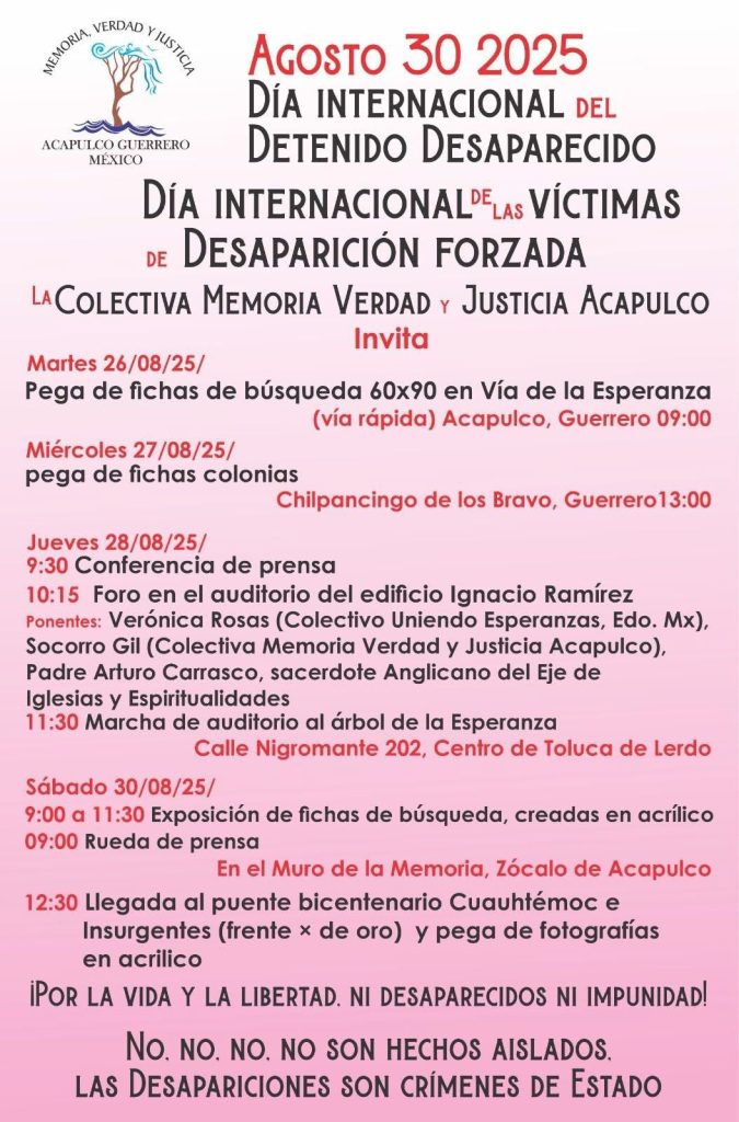 Por su parte, la Colectiva Memoria Verdad y Justicia Acapulco realizará actividades de visibilización con la pega de fichas de búsqueda en colonias, conferencias, un foro en el edificio Ignacio Ramírez y una marcha al árbol de la Esperanza, además de la exposición de fotografías en el Muro de la Memoria en el Zócalo de Acapulco el 30 de agosto.