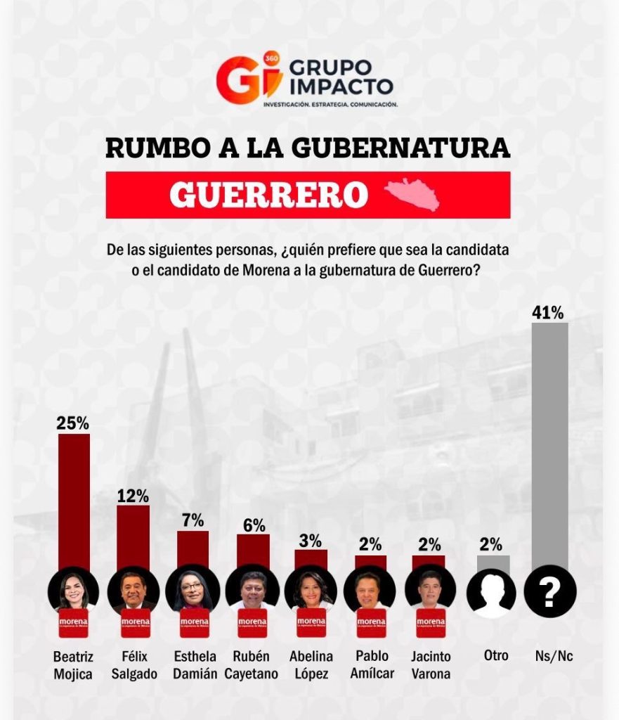 Por su parte, la encuesta de Grupo Impacto refuerza esta tendencia al ubicar a Morena con 49% de preferencia electoral, frente a PRI (9%), Movimiento Ciudadano (6%), PAN (3%) y PT (1%), con 32% de personas indecisas. En la definición interna del partido, Mojica aparece con 25%, por encima de Félix Salgado Macedonio (12%), Esthela Damián (7%), Rubén Cayetano (6%) y Abelina López (3%).